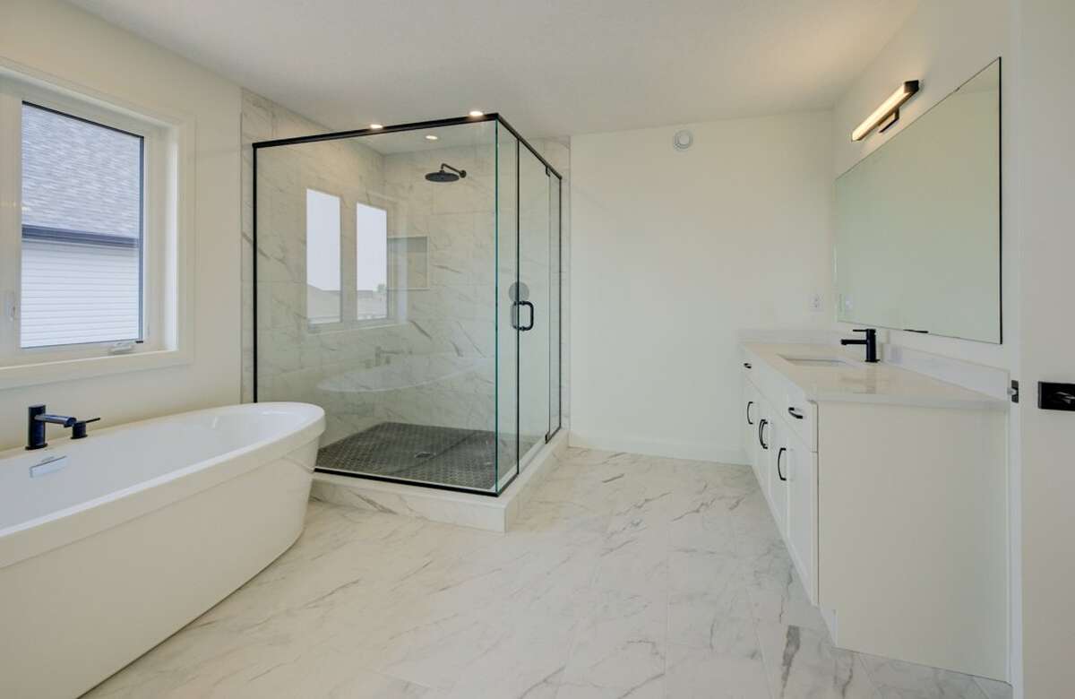 Upstairs, discover a spacious loft and four generous bedrooms, including a luxurious primary suite complete with two walk in closets and a spa-like ensuite featuring a freestanding soaker tub, two separate vanities, and a glass-enclosed shower.