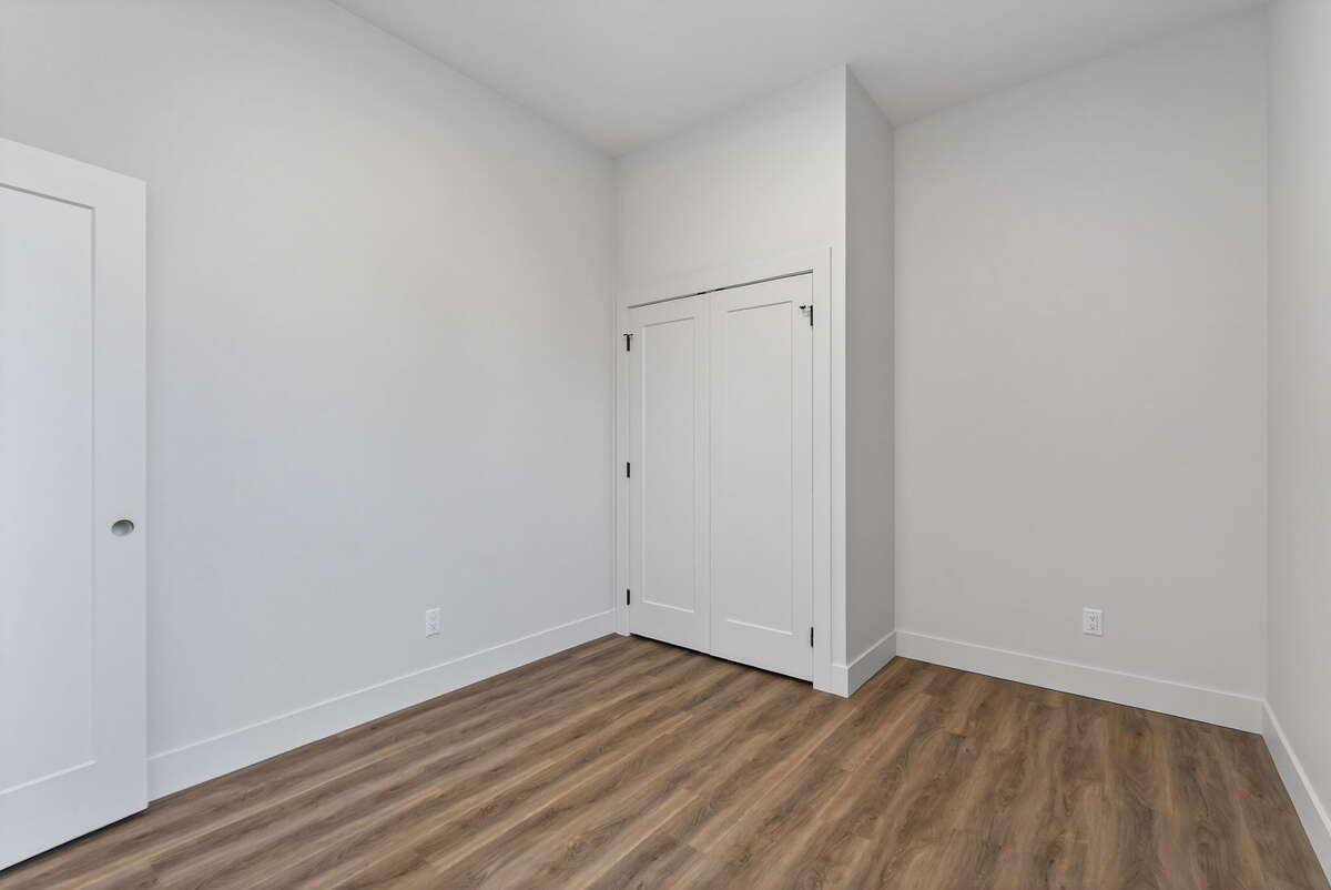 The primary bedroom features white oak accents that seamlessly connect it to the rest of the home. A sliding barn door to connects to an expertly designed ensuite and walk-in closet that feature smart storage solutions, luxurious stone work, and a double vanity.