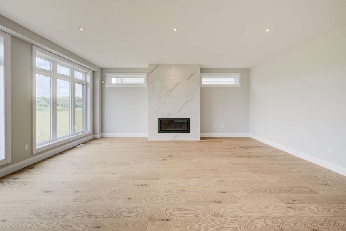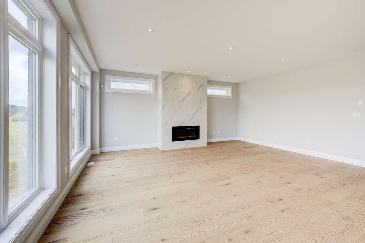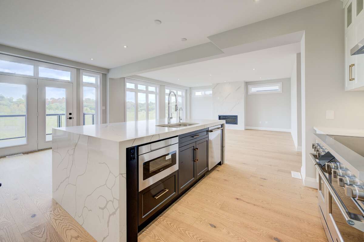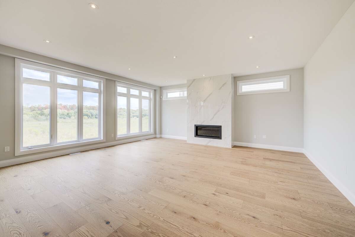 Backing onto the beautiful Grand River Valley, 329 Rivertrail Ave, Kitchener, ON offers 3,621 finished sq. ft., an attached double garage, paved driveway, rear deck, and an unfinished walk-out basement with excellent potential for additional living space. Inside, the airy foyer soars with an upper window and skylight that flood the space with natural light. The main floor (9-ft ceilings) features a family room, kitchen, dinette, dining room, den, and a three-piece bathroom. The family room is framed by large windows with valley views and includes a modern linear gas fireplace and bright recessed pot lights.