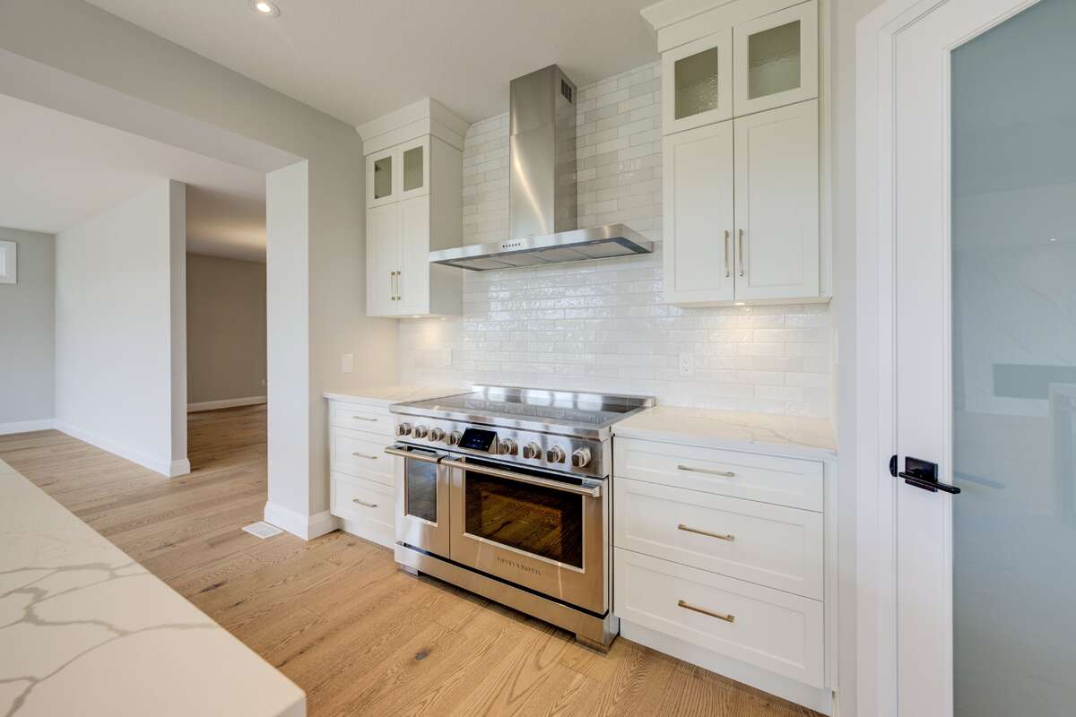 The chef’s kitchen—also bathed in natural light—showcases upgraded white, ceiling-height cabinetry with upper glass doors, premium quartz countertops, six professional appliances, and a walk-in pantry. An expansive black island with breakfast bar doubles as a workspace and gathering hub, topped with marbled quartz that cascades in a dramatic waterfall edge. The generous dinette accommodates a large table, with sizeable windows and a glass terrace door that opens to the rear deck. Durable hardwood spans the main level (tile in the bathroom), and an oak staircase is illuminated by a landing window.